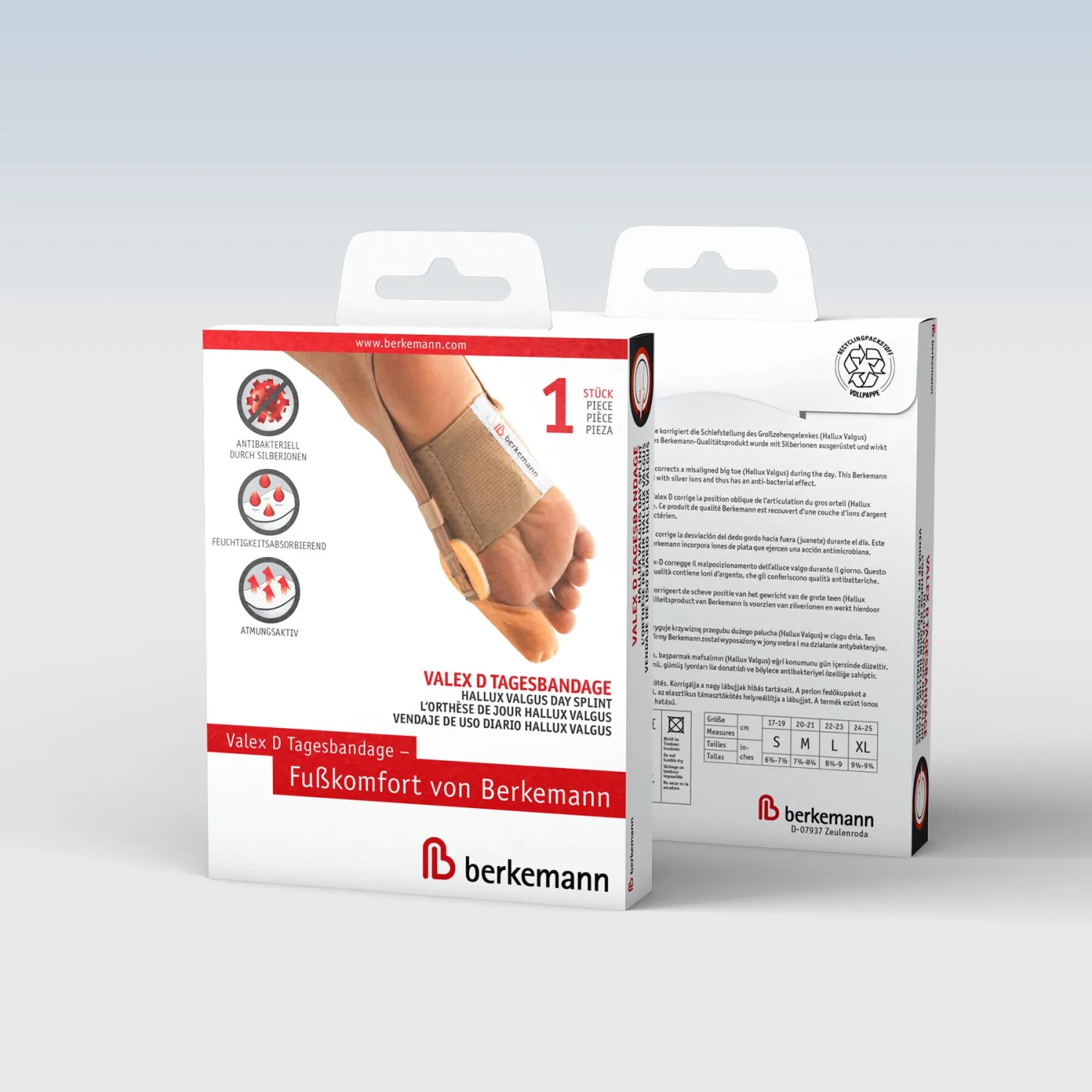 Aus elastischem Gummigewebe, mit Perlonhaube, Polsterring und Pelotte. Die Valex D Tagesbandage erleichtert, trotz Hallux Valgus-Beschwerden, das Tragen passenden Schuhwerks. Dabei wirkt der Polsterring druckmindernd, während die Perlonhaube die Großzehe sanft in ihre Ursprungsposition korrigiert. Zusätzlich wirkt die Bandage mit Pelotte positiv aufs Quergewölbe. Dieses hochwertige Produkt ist CE-zertifiziert, mit Silberionen aus-gerüstet und wirkt somit antibakteriell.
