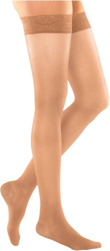 • der Schenkelstrumpf mit Platinum-Haftband sorgt für einen sicheren Halt